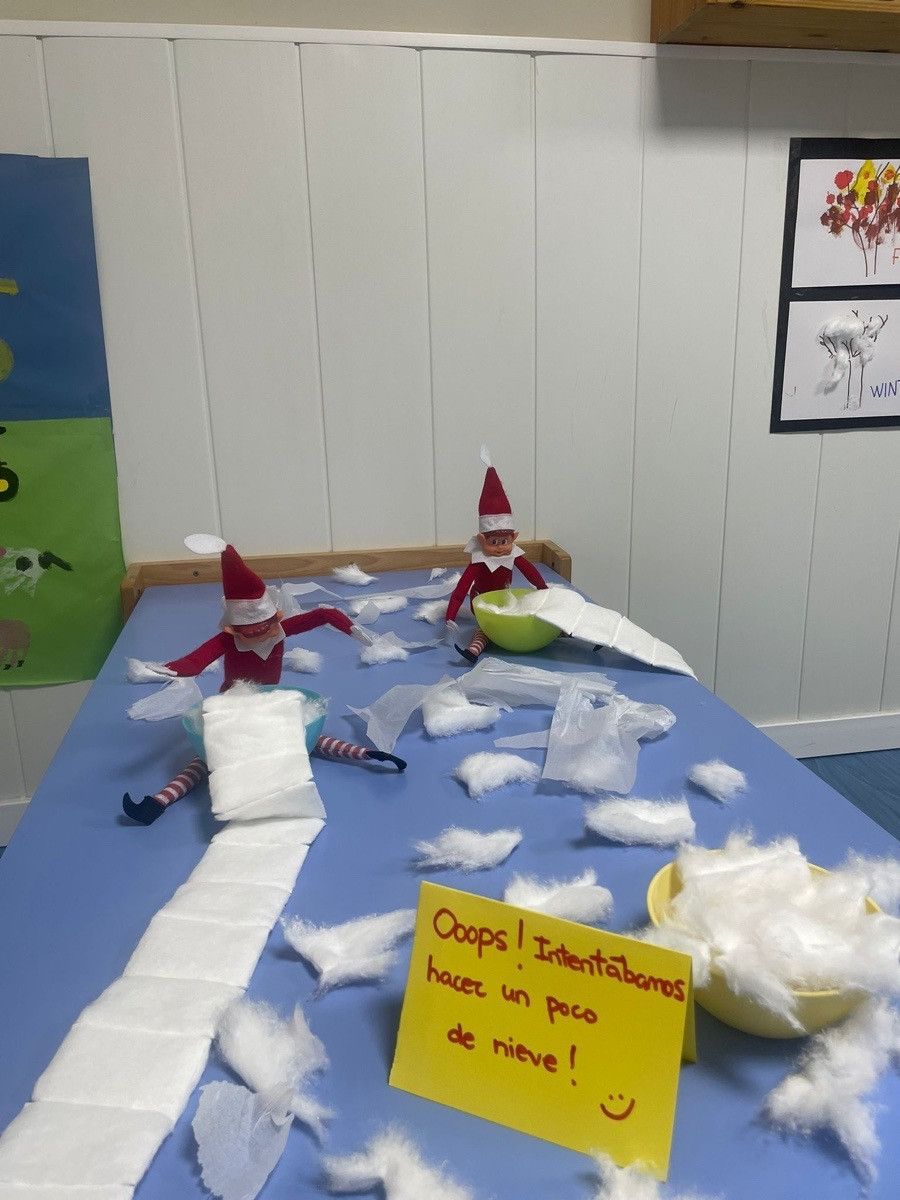 Esta semana nuestra clase ha vivido una auténtica aventura nevada, cortesía de nuestros traviesos amigos: ¡los elfos navideños! Y es que, cuando entramos por la mañana… ¡sorpresa! Papeles por todas partes, algodón volando y dos elfitos muy orgullosos sentados en medio de su “obra de arte”. Según su nota, solo estaban intentando hacer un poco de nieve… pero está claro que se les fue un poquito de las manos. 😄
